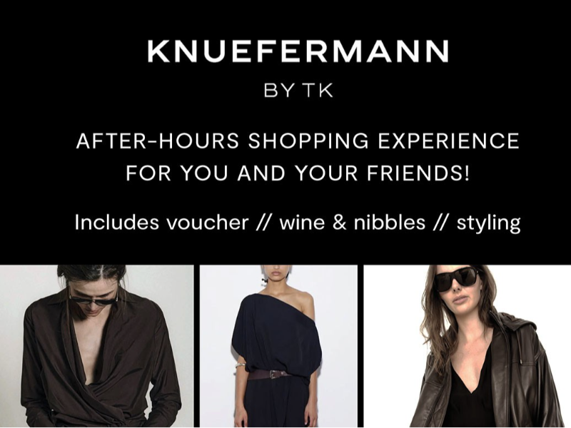 Enjoy exclusive after-hours access from 6–9pm as you and three friends experience a private shopping event hosted by renowned designer Turet Knuefermann. Receive personalised styling advice while browsing beautifully crafted collections in a relaxed and intimate setting.