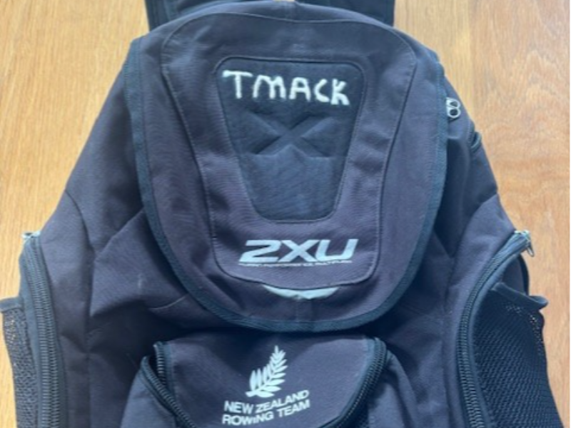 • - Rowing New Zealand backpack marked “TMACK” (well used with plenty of character; main zip works, some side zips not working)